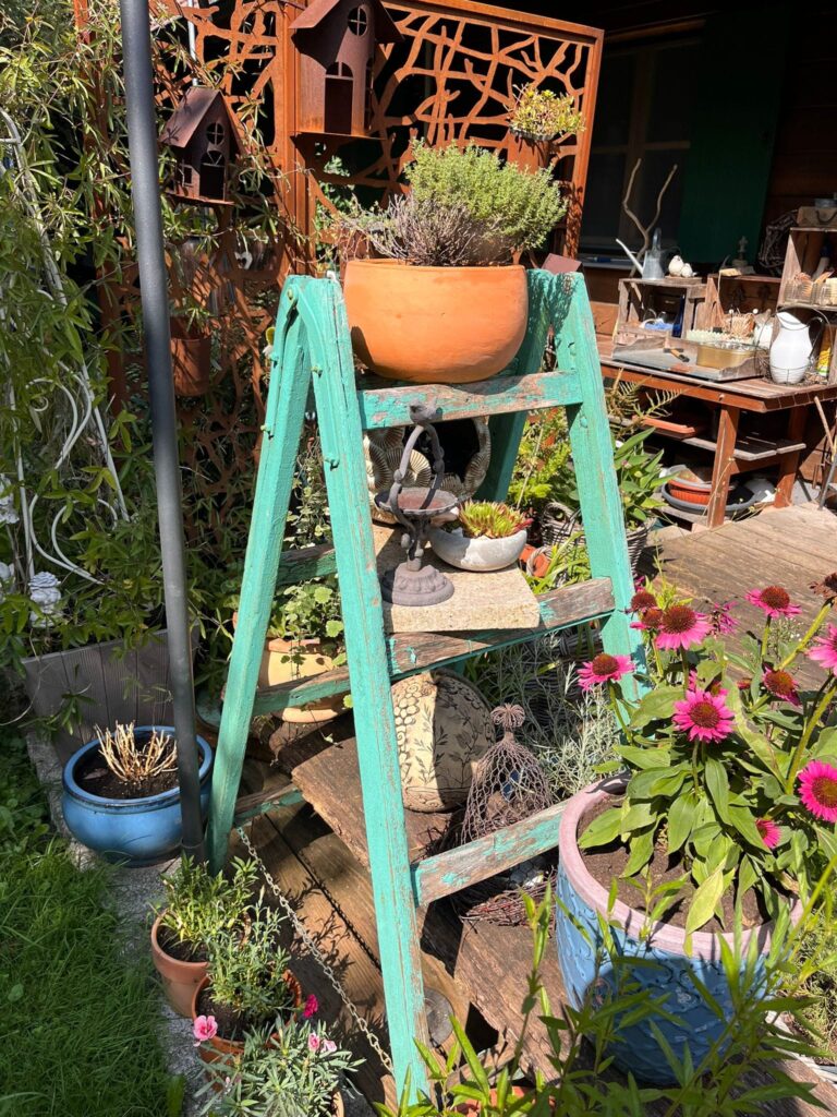 (wo man sich niederlassen möcht‘) mit liebevollst angelegten Beeten und malerischen Ecken, Skulpturen und selbstbewussten Katzen und wurden mit herrlichster kräuterhaltiger Brotzeit verköstigt.